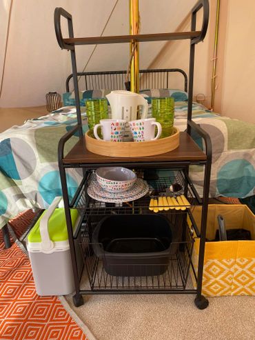 4 cups, plates, bowls and side plates, plastic tumblers, knives, forks, spoons and teaspoons